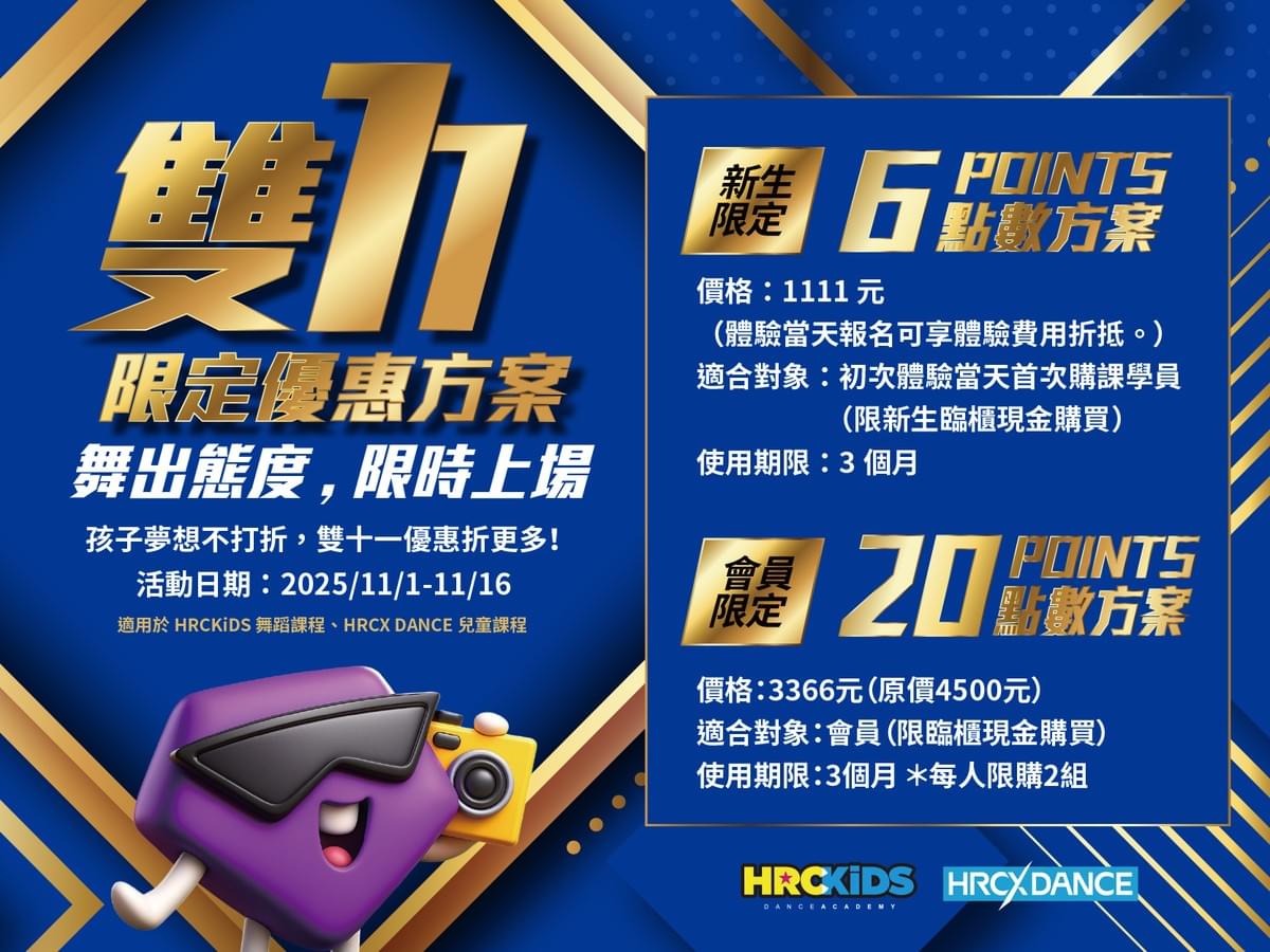 - 【兒童街舞課程雙十一限定優惠方案】 - 孩子夢想不打折,爸爸媽媽荷包省!雙十一優惠折起來! - 11/1~11/16 HRC KiDS雙十一限定優惠方案 !舞出態度,限時上場! - 活動日期:2025/11/1-11/16 - [6點方案] - -適合對象:初次體驗當天首次購課學員(限新生臨櫃現金購買) - -使用期限:3個月 - -價格:1111元(體驗當天報名可享體驗費用折抵。) - -適用於HRCKiDS舞蹈課程、HRCX DANCE兒童課程 - [20點方案] - -適合對象:HRC KiDS會員(限臨櫃現金購買) - -使用期限:3個月 - -價格:3366元(原價4500元) - -適用於HRCKiDS舞蹈課程、HRCX DANCE兒童課程 - *每人限購2組